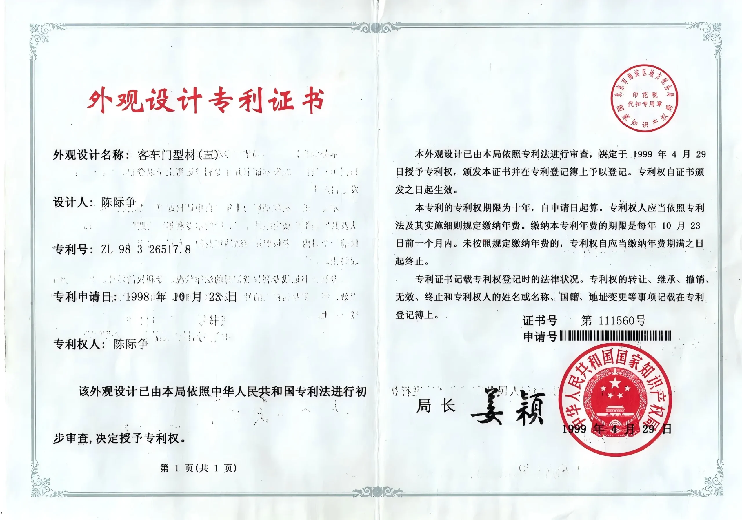 Национальные технические патенты: пионер в области дверей, открывающихся внутрь и наружу. Получил пять национальных технических патентов на алюминиевые двери для автомобилей, закрепив за собой лидирующие позиции в отрасли.